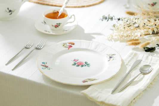 The Anna Garden collection, crafted from fine bone china, features an elegant assortment of teaware, dessert plates, and dinner plates. This exquisite collection is embossed with swirling leaf designs and adorned with delicate floral prints in soft, vibrant hues, complemented by gold accents. This timeless collection is perfect for adding a touch of refined elegance to any tea gathering or dining occasion.