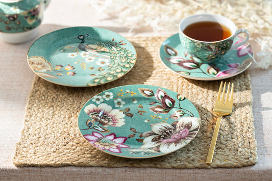 Peacock Lotus Garden Green Fine Porcelain Dessert Plate Set of 2