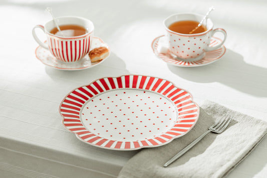 Red Josephine Stripes and Dots Scallop Fine Porcelain Dessert Plate