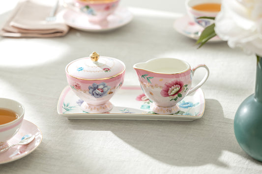 Pink Flower Garden Fine Porcelain Sugar Creamer & Serving Tray Set