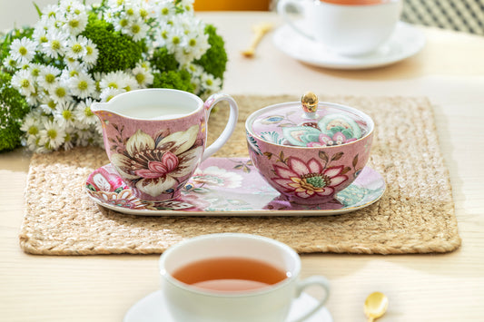 Gift Boxed Peacock Lotus Garden Pink Fine Porcelain Sugar Creamer & Serving Tray Set