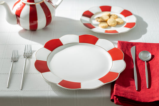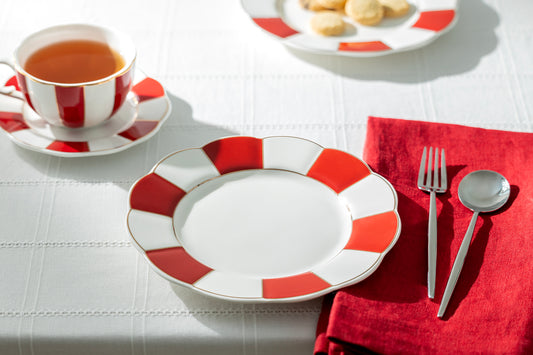 The Red and White Scallop collection brings a playful yet elegant charm to your table, featuring a tea cup and saucer set, dessert plate, and dinner plate. With bold red and white patterns accented by delicate gold detailing and scalloped edges, this collection is perfect for adding a vibrant touch to any gathering or daily dining experience.