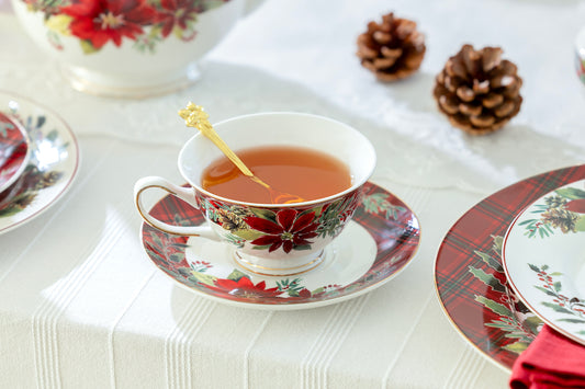 Poinsettia Pine Cone Fine Porcelain Tea Cup and Saucer