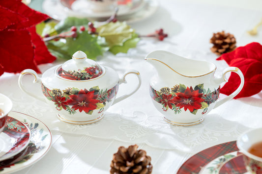 Poinsettia Pine Cone Fine Porcelain Sugar & Creamer Set