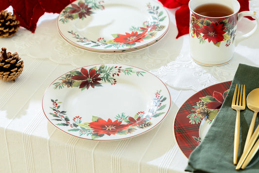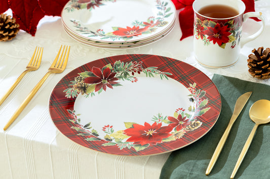 Poinsettia Pine Cone Plaid Fine Porcelain Dinner Plate