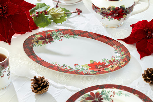 Poinsettia Pine Cone Fine Porcelain Oval Serving Platter