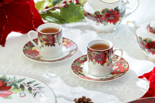 Poinsettia Pine Cone 3oz Demitasse Cups and Saucers with Gift Box