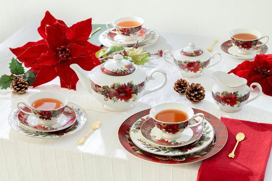 Poinsettia Pine Cone Fine Porcelain Tea Set