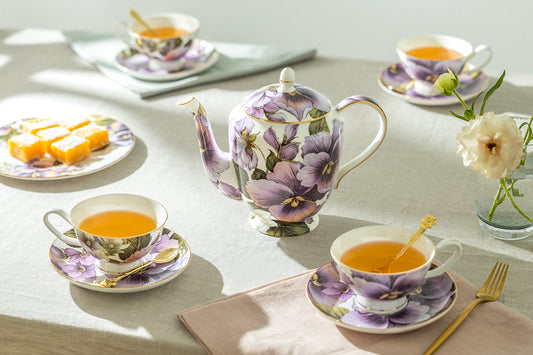 Purple Gold Pansy Bone China Tea Set