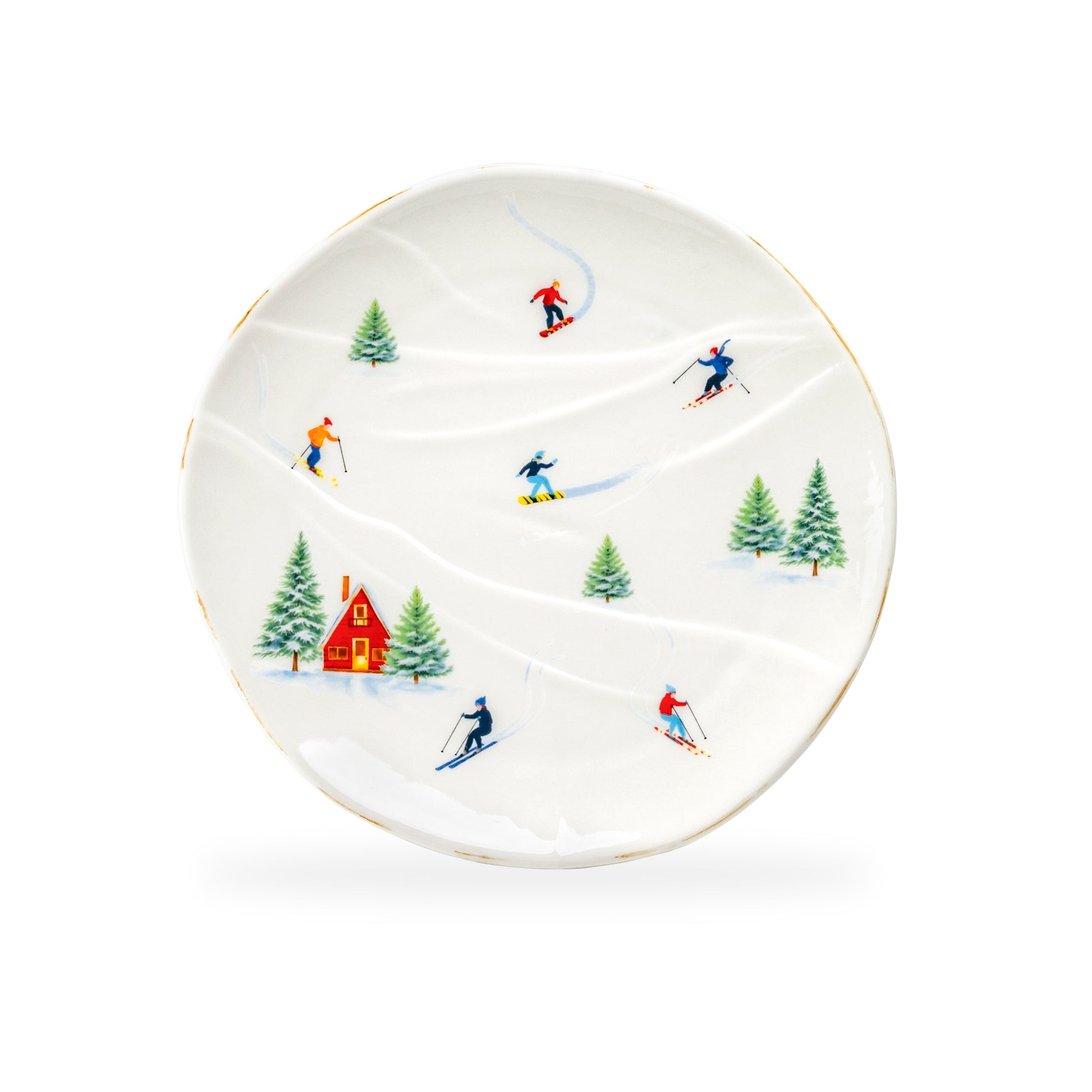 The 8.75-inch Winter Ski Slope Dessert/Salad Plate brings a touch of alpine magic to your table with its enchanting engraved design of mountain slopes, featuring skiers, snowboarders, and a charming red cabin nestled among snow-dusted pine trees. The plate’s unique uncontinuous rim—stylishly broken to mimic the rugged, outdoor look of a winter landscape—adds an artistic flair.